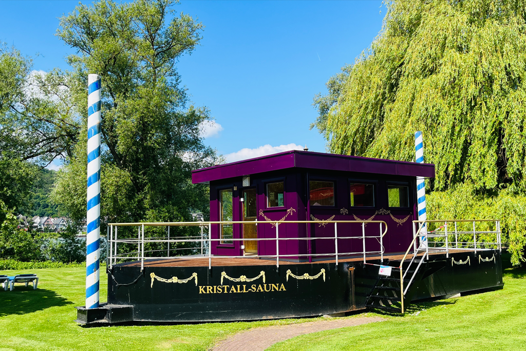 In unserer Kristall-Sauna können Saunafreunde bei angenehmen 80 °C so richtig entspannen und den herrlichen Blick auf den Rhein genießen.